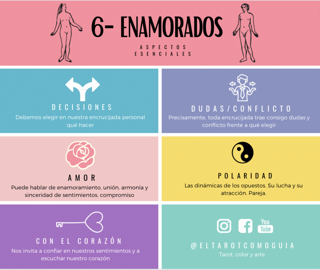 El Enamorado o Los Enamorados del Tarot es una carta de decisiones, en ese sentido, tiene un tinte de compromiso con las elecciones personales. Habla también de amor y enamoramiento: elegir a alguien o alguna situación. Hace énfasis en el camino del corazón.